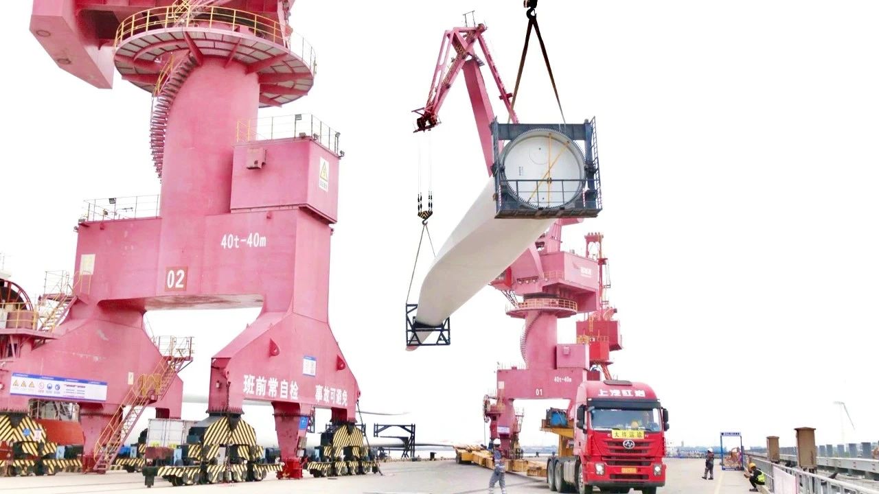 日前,記者走進鹽城港射陽港區,多輛大件運輸車正將風電葉片運往碼頭。在吊鉤固定完成后,操作人員操控起重機將葉片及配套工裝緩緩吊運至貨輪,并精準安放在指定位置。現場作業人員全神貫注,確保每片葉片都能安全、準確地完成裝載,整個碼頭呈現出一派熱火朝天的作業景象。