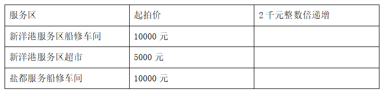 競(jìng)拍形式:公開競(jìng)拍,拍租期限為1年,每個(gè)服務(wù)區(qū)的競(jìng)拍項(xiàng)第一年承租費(fèi)起拍價(jià)為1萬元,按2千元整數(shù)倍遞增(如2000、4000、6000、8000……)。如下表:
