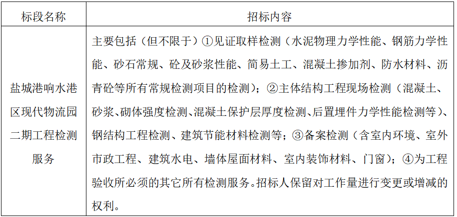 8、項目標段劃分:鹽城港響水港區(qū)現(xiàn)代物流園二期工程檢測服務共為1個標段,標段信息如下: