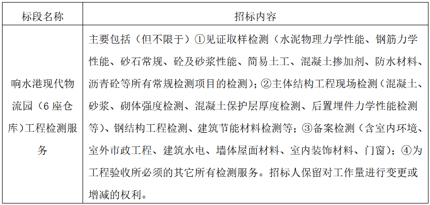 8、項(xiàng)目標(biāo)段劃分:響水港現(xiàn)代物流園(6座倉庫)工程檢測服務(wù)共為1個(gè)標(biāo)段,標(biāo)段信息如下: