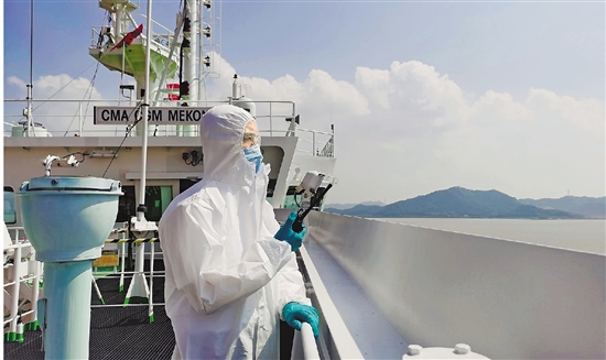 今年突如其來的新冠肺炎疫情,給港口防疫和生產(chǎn)作業(yè)帶來嚴(yán)峻挑戰(zhàn)。引航是船舶從境外進(jìn)入國內(nèi)的第一道大門,必須嚴(yán)防死守。為此,寧波舟山港規(guī)定,引領(lǐng)船舶作業(yè)時,引航員除了戴上口罩、手套等防護(hù)用品外,還應(yīng)采取穿防護(hù)服、戴護(hù)目鏡等防護(hù)措施。