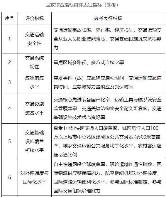 為貫徹落實(shí)《交通強(qiáng)國(guó)建設(shè)綱要》《國(guó)家綜合立體交通網(wǎng)規(guī)劃綱要》,客觀評(píng)估交通強(qiáng)國(guó)建設(shè)進(jìn)程和開展國(guó)際對(duì)標(biāo),科學(xué)引導(dǎo)各地區(qū)、各行業(yè)加快建設(shè)交通強(qiáng)國(guó),充分發(fā)揮交通強(qiáng)國(guó)建設(shè)評(píng)價(jià)指標(biāo)體系的“標(biāo)尺”和“指揮棒”作用,制定本指標(biāo)體系。