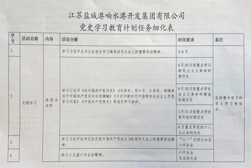 5月29日,響水港區(qū)在集中學(xué)習(xí)會上傳達(dá)學(xué)習(xí)了《響水港黨史學(xué)習(xí)教育計(jì)劃任務(wù)細(xì)化表》,向全體黨員和員工講知了細(xì)化任務(wù)。圍繞指定四本學(xué)習(xí)書籍,分期分段學(xué)習(xí),做到有學(xué)習(xí)、有研討、有發(fā)言、有體會,讓黨史學(xué)習(xí)教育往深里走、往實(shí)里走,促使黨員干部進(jìn)一步增強(qiáng)“四個(gè)意識”,堅(jiān)定“四個(gè)自信”,做到“兩個(gè)維護(hù)”。