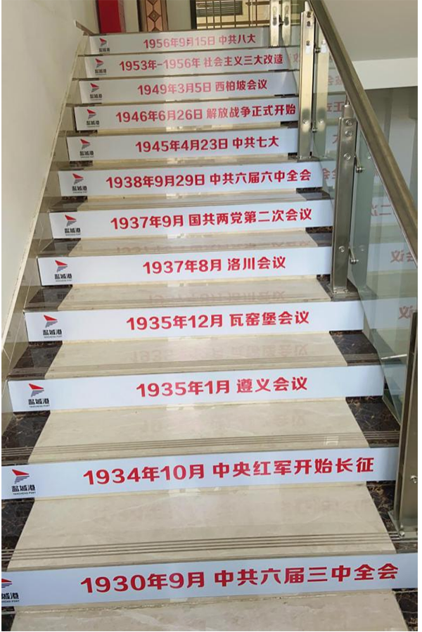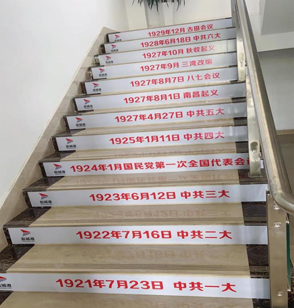 針對廣大干部職工工作實(shí)際,響水港區(qū)精心設(shè)計(jì),細(xì)心研究,將學(xué)習(xí)形式和載體不斷創(chuàng)新。近日,響水港區(qū)創(chuàng)新打造“樓梯課堂”,將黨史發(fā)展時(shí)間歷程貼印在樓梯上,方便大家在上班閑暇時(shí),無形地將黨史知識學(xué)進(jìn)腦子里?!皹翘菡n堂”的每一個(gè)階梯同時(shí)也代表著黨的每一個(gè)發(fā)展歷程,一步一臺階,扎扎實(shí)實(shí)譜新篇。響水港區(qū)員工普遍反映這個(gè)學(xué)習(xí)方式有創(chuàng)意有實(shí)效,鞏固加深了他們對黨史的掌握程度,也提高了他們學(xué)習(xí)黨史的興趣。