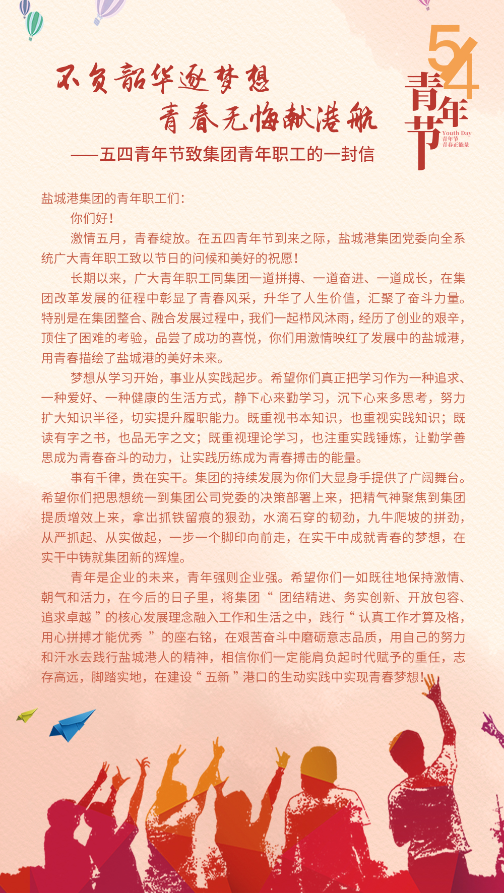 激情五月,青春綻放。在五四青年節到來之際,鹽城港集團黨委向全系統廣大青年職工致以節日的問候和美好的祝愿!