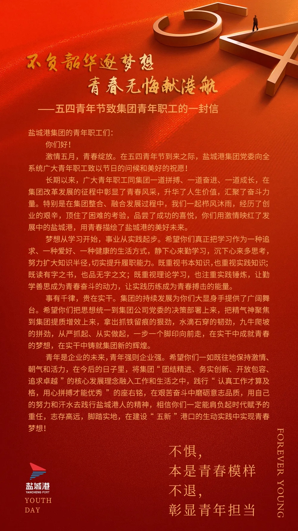 火紅青春,激情五四。今年是紀(jì)念五四運(yùn)動(dòng)102周年,5月7日,鹽城港集團(tuán)組織開展“五四”青年節(jié)紀(jì)念活動(dòng),持續(xù)推進(jìn)黨史學(xué)習(xí)教育,匯聚青春正能量,激勵(lì)廣大青年干部在黨史學(xué)習(xí)教育中深刻感悟五四愛國精神,賡續(xù)使命、接續(xù)奮斗,為新時(shí)代港航事業(yè)貢獻(xiàn)青春之力。系統(tǒng)內(nèi)各港區(qū)、各板塊、鹽城港引航站、機(jī)關(guān)各部門100余名青年同志參加。