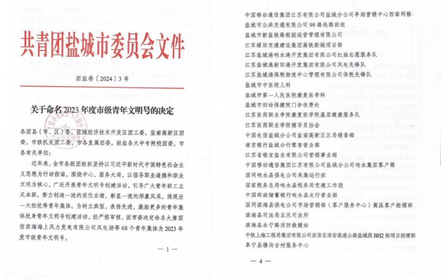 近日,共青團鹽城市委發(fā)布《關(guān)于命名2023年度市級青年文明號的決定》,集團響水港開發(fā)集團紅燭志愿服務(wù)隊、射陽港開發(fā)集團風(fēng)電先鋒隊、保稅物流中心保稅先鋒隊三家集體獲評市級青年文明號稱號。