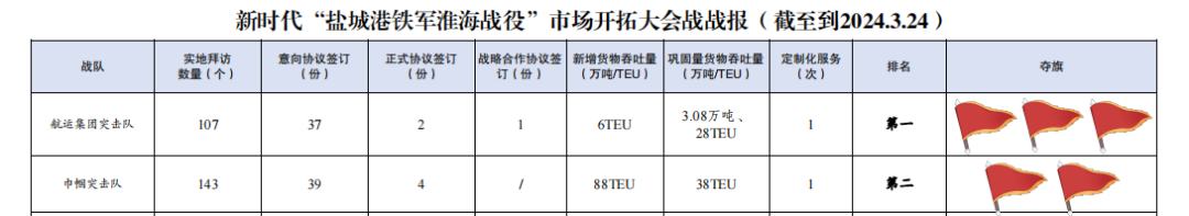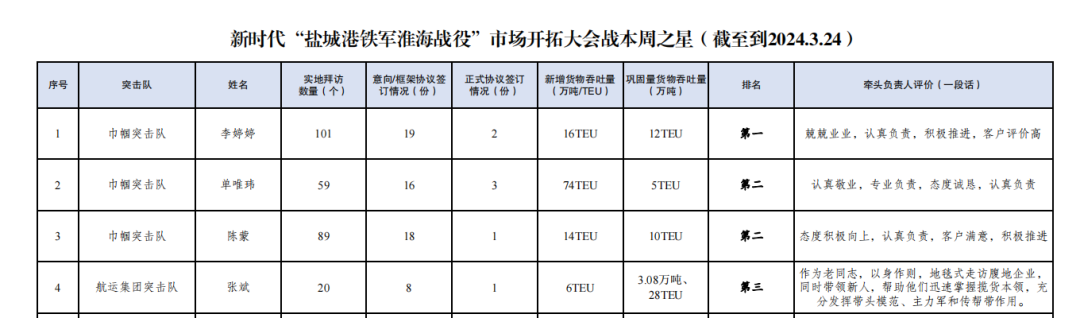 自新時(shí)代“鹽城港鐵軍淮海戰(zhàn)役”市場(chǎng)開(kāi)拓大會(huì)戰(zhàn)開(kāi)展以來(lái),航運(yùn)集團(tuán)積極響應(yīng)鹽城港集團(tuán)黨委號(hào)召,成立航運(yùn)集團(tuán)突擊隊(duì)和巾幗突擊隊(duì),持續(xù)深化攬貨拓源,大力弘揚(yáng)“鐵軍精神”,成功實(shí)現(xiàn)市場(chǎng)開(kāi)拓“新突破”,將定制化、兜底式服務(wù)推向了“新高度”。截至目前,累計(jì)拜訪客戶308家,簽訂意向協(xié)議97份,簽訂正式協(xié)議8份,實(shí)現(xiàn)新增營(yíng)收超100萬(wàn)元,集裝箱走量1008TEU。根據(jù)新時(shí)代“鹽城港鐵軍淮海戰(zhàn)役”指揮部第二期戰(zhàn)報(bào),航運(yùn)集團(tuán)包攬集體前兩名,個(gè)人前三名,全力打響“鹽城港鐵軍淮海戰(zhàn)役”市場(chǎng)開(kāi)拓大會(huì)戰(zhàn)第一槍。