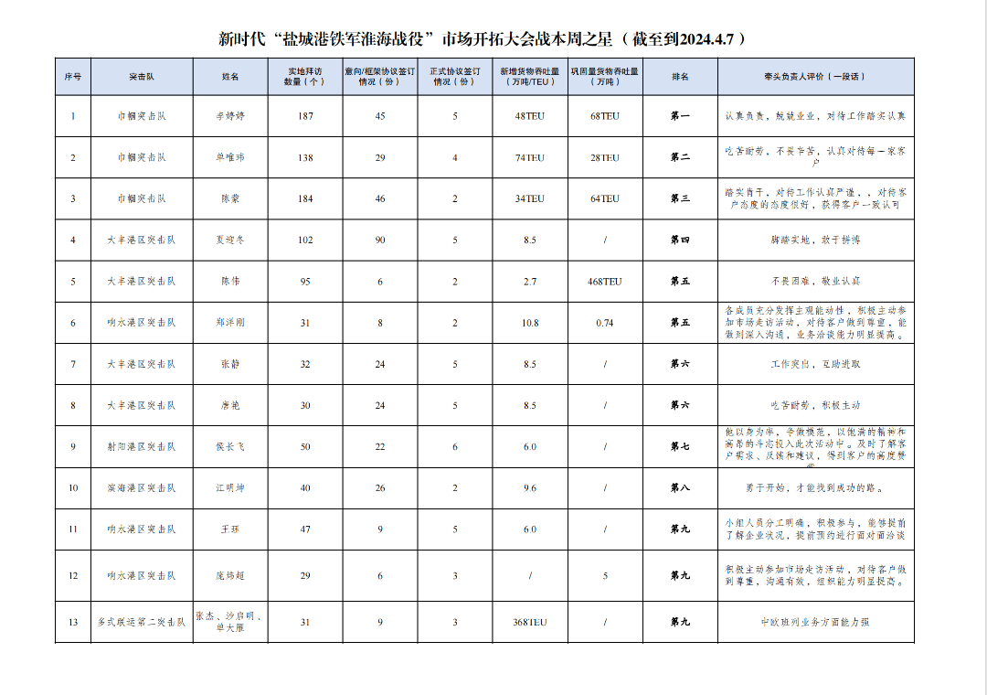 2.簽訂意向協(xié)議數(shù)量930份:其中大豐港區(qū)突擊隊254份,響水港區(qū)突擊隊103份,黨員突擊隊100份,巾幗突擊隊76份,濱海港區(qū)突擊隊76份,航運集團突擊隊67份,射陽港區(qū)突擊隊64份,建湖港區(qū)突擊隊55份,阜寧港區(qū)突擊隊40份,亭湖港區(qū)突擊隊38份,多式聯(lián)運第一突擊隊28份,多式聯(lián)運第二突擊隊22份,青年突擊隊7份。