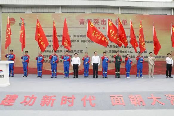 活動中,與會領導為12個圍繞服務重大項目而組成的青年集體突擊隊進行授旗,青年突擊隊、青年文明號代表作表態(tài)發(fā)言,并舉行了“強國復興有我 青春燃在海港”鹽城港青年宣誓儀式。