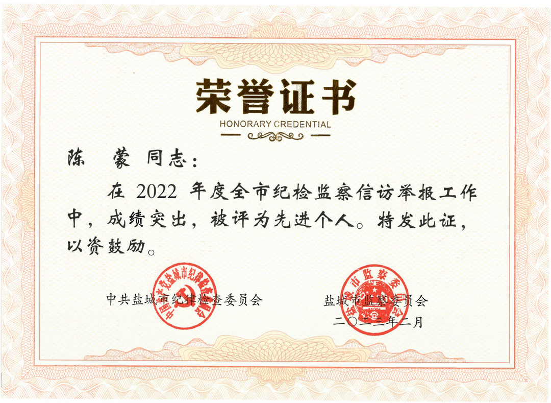 近日,中共鹽城市紀委、鹽城市監(jiān)委發(fā)布關(guān)于表揚2022年度全市紀檢監(jiān)察信訪舉報工作先進集體和先進個人的決定,集團紀檢監(jiān)察第三派駐組副組長、鹽城港引航站黨總支書記、鹽城港拖輪服務(wù)公司支部書記陳蒙同志榮獲“2022年度全市紀檢監(jiān)察信訪舉報工作先進個人”榮譽稱號。