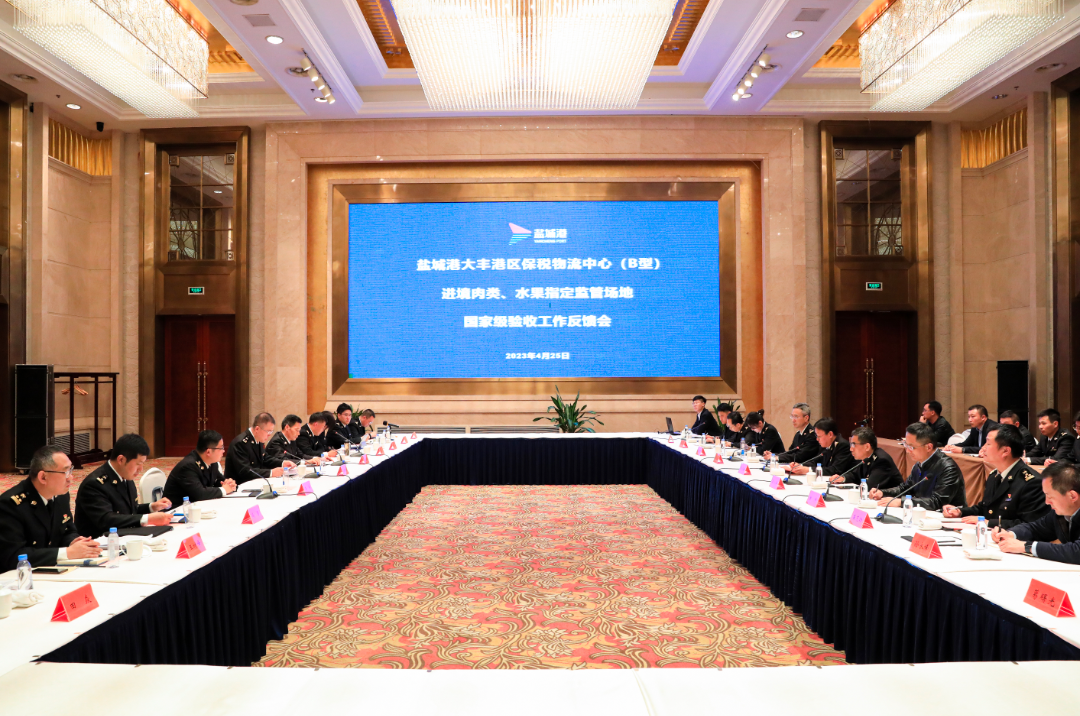 4月25日,國家海關總署組織專家驗收組對鹽城港保稅物流中心(B型)進境肉類、水果指定監管場地進行國家級驗收,經過專家驗收組的認真查驗審核,同意鹽城港保稅物流中心(B型)進境肉類、水果指定監管場地通過國家級驗收。國家驗收組,鹽城港集團黨委書記、董事長周正雄,鹽城海關黨委書記、關長吳志明,鹽城港集團黨委副書記、董事、總經理陸帥,南京海關、鹽城海關、市商務局相關負責同志等參加驗收。
