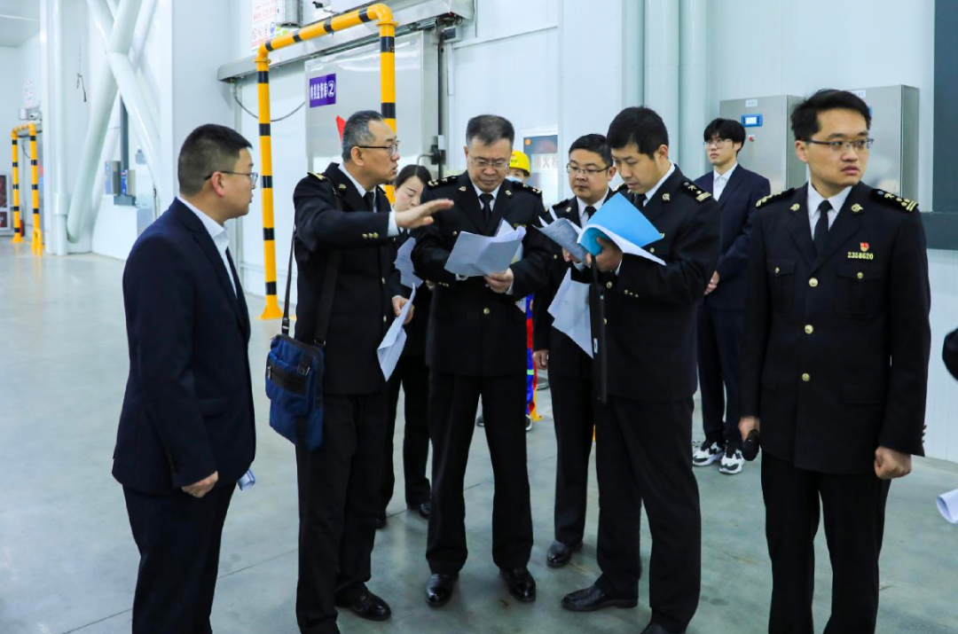 驗收期間,國家驗收組一行前往保稅物流中心,對前置攔截區,肉類、水果指定監管場地進行驗核,現場聽取相關情況介紹,隨即召開內部研討,就驗收情況進行內部評議,并與南京海關、鹽城海關相關負責同志對驗核情況進行交流。