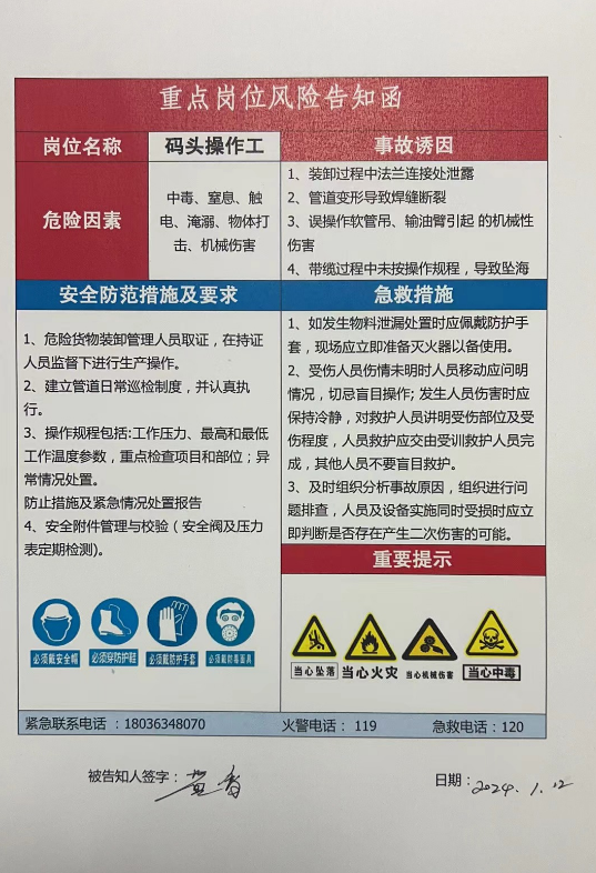 堅持實戰為要,全局性謀劃、整體性推進,不斷提升風險防范和應急管理能力。一是筑牢雙重預防體系。圍繞重點地段、重點崗位、重點人員,建立崗位提示函、告知卡,排查重點崗位從業人員628人(含場所租賃單位、勞務外包單位),辨識較大以上和重大風險源116處,制定管控措施3145條;二是持續推動安全標準化建設。按照安全生產8大要素,扎實推進管理制度化、常態化,截至目前,智慧港口公司、射陽港區、濱海港區、港儲石化、阜寧港區完成安全生產一級標準化驗收,響水港區、建湖港區、成品油公司完成安全生產二級標準化驗收,亭湖港區完成安全生產三級標準化驗收。三是強化應急處置能力。建立完善關鍵崗位輪崗備勤制度,確保關鍵崗位正常輪轉;結合應急處置的規律特點和效果評估,圍繞重點地段有針對性地開展現場處置演練,常態化督促各港區每月開展1次實戰演練,全面提升實戰能力。