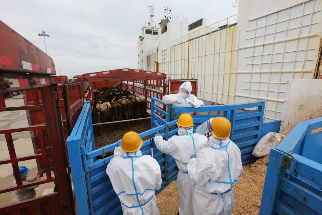 早在船舶抵港前一周,鹽城港船舶代理公司便聯(lián)系各方召開了船前會,部署安排各項準備工作,及時向船方通報相關要求,同時密切關注航行動態(tài)以及活牛健康狀況。到港前,正值強對流天氣多發(fā)季節(jié),碼頭人員密切關注天氣狀況,天氣一經(jīng)轉(zhuǎn)好便聯(lián)系引水拖輪,搶抓窗口期安排船舶進港,同時提前安排轉(zhuǎn)運車輛消殺進港,船舶靠港后,碼頭工作人員認真組織防疫、消殺工作,在最短時間內(nèi)完成聯(lián)檢工作,為活牛卸船爭取了時間。