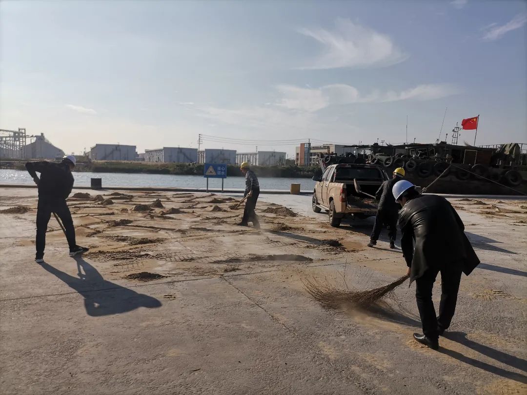 航運(集裝箱)集團在首次承接的黃砂集改散業務中。26個集裝箱小柜近800噸黃砂僅用時3.6小時就完成作業,順利交貨,生產調度中心及運營操作部負責人全部在一線負責指揮調度,并在作業完成后,為了不影響場地的后續使用,帶頭扛起鐵鍬沖到現場清理,經過近2小時的清理,3余噸的殘余沙石貨物全部清理完畢,不僅得到了貨主的贊揚,也向所有同事及兄弟單位展現了有困難一起上,見石頭齊心抬的團隊精神。
