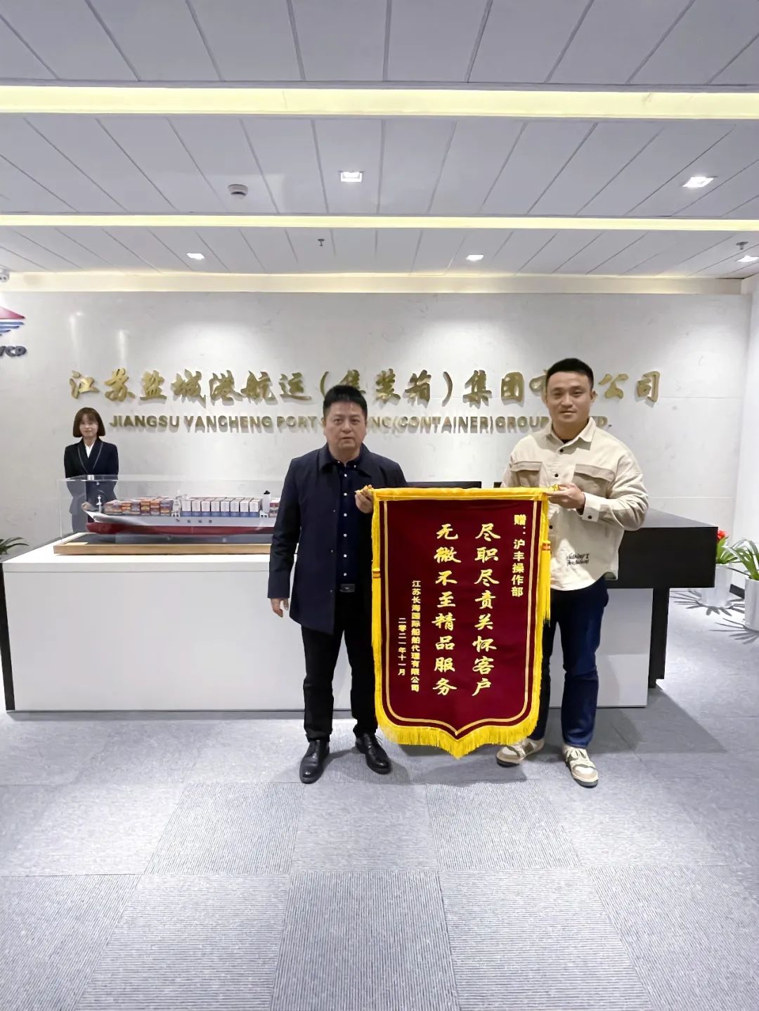11月12日,江蘇長海國際船舶代理有限公司業務經理吳長春一行拜訪江蘇滬豐集裝箱物流有限公司,將一面寫有“盡職盡責關懷客戶,無微不至精品服務”的錦旗送到滬豐公司,對滬豐公司操作部近年來提供的優質高效服務表示感謝。