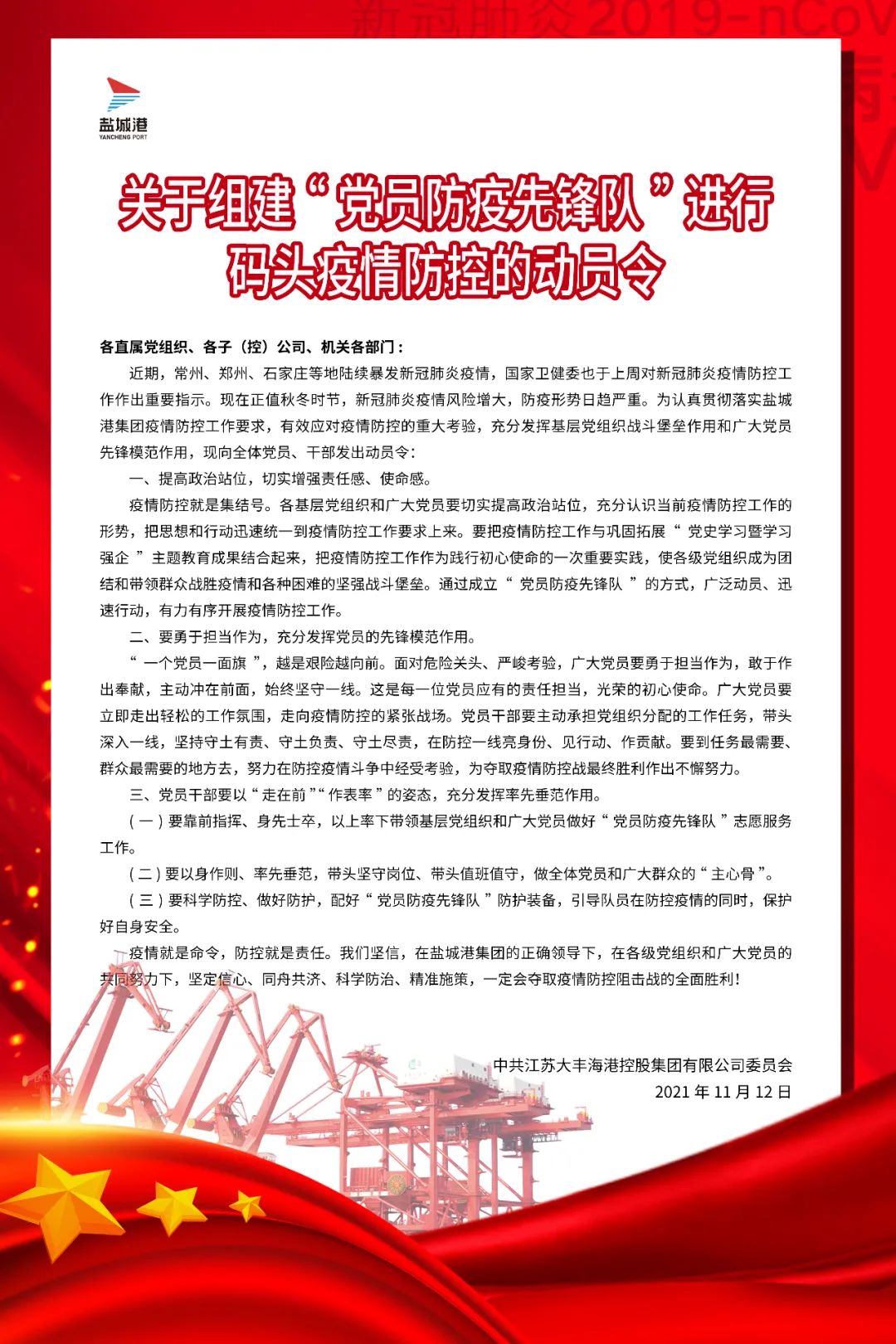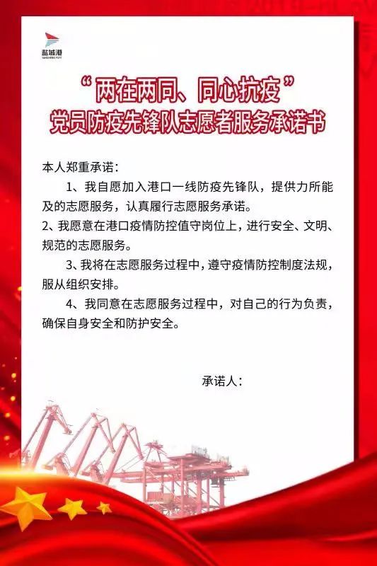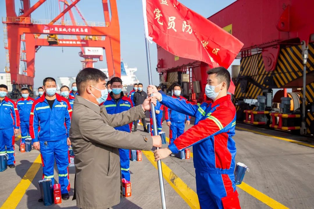 “我自愿加入港口一線黨員防疫先鋒隊,提供力所能及的志愿服務……”11月15日,由大豐港區、航運(集裝箱)集團64名黨員組成的防疫先鋒隊向黨旗作出鄭重承諾。面對當前疫情反復的形勢,鹽城港大豐港區積極響應“兩在兩同””建新功行動號召,嚴格貫徹落實鹽城港集團疫情防控工作要求,以“50天大比武”活動為契機,充分發揮“我是黨員,向我看齊”的先鋒模范作用,讓黨旗飄揚在疫情防控最前線,確保港口生產、防疫“兩手抓、兩不誤”。