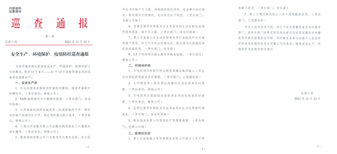 安全巡查員每日對港區內安全生產、環境保護、疫情防控工作進行檢查,對進港人員信息登記、作業人員勞動防護用品穿戴、作業現場安全管理等情況逐一細致排查,確保不放過一個死角,不留下一個隱患。對巡查中發現的問題隱患,及時下發整改通知單,要求相關責任單位、部門限期整改,并對照整改時限進行復查,確保隱患整改到位。