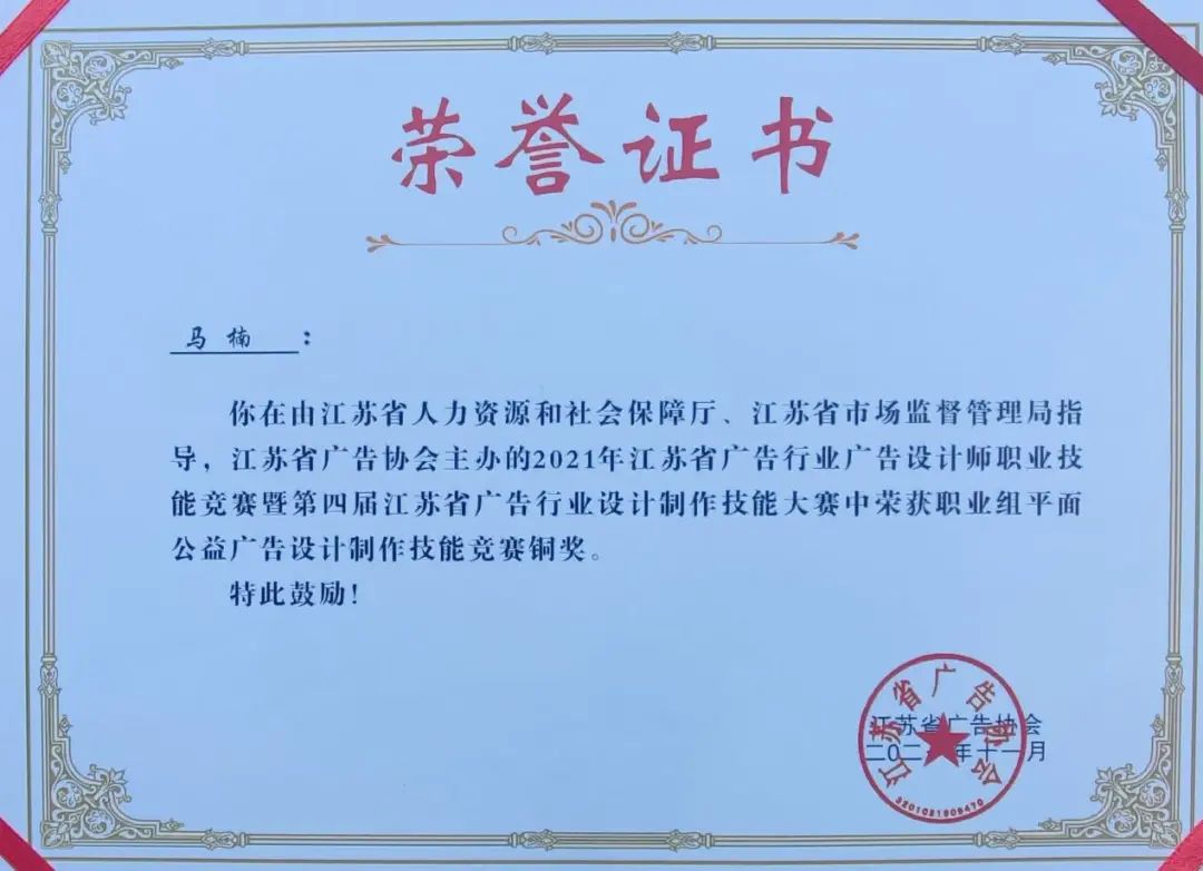 此次大賽是第四屆江蘇省百萬(wàn)技能人才技能競(jìng)賽崗位練兵活動(dòng)其中一項(xiàng)重要賽事,由江蘇省人力資源和社會(huì)保障局、江蘇省市場(chǎng)監(jiān)督管理局、江蘇省廣告協(xié)會(huì)聯(lián)合舉辦,以“永遠(yuǎn)跟黨走”競(jìng)賽主題,內(nèi)容包含廣告專(zhuān)業(yè)理論知識(shí)考試和技能實(shí)操競(jìng)賽,來(lái)自全省各市區(qū)130多支代表隊(duì)參加角逐。其中,文化傳媒公司5名參賽選手在理論知識(shí)考試和技能實(shí)操競(jìng)賽成績(jī)中取得優(yōu)異成績(jī),均獲得三級(jí)廣告設(shè)計(jì)師職業(yè)技能等級(jí)證書(shū)。