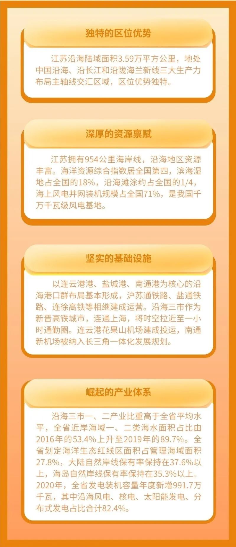 江蘇“十四五”規(guī)劃綱要明確,沿海地區(qū)深化港產(chǎn)城融合發(fā)展,著力提升海洋經(jīng)濟、生態(tài)經(jīng)濟和樞紐經(jīng)濟,打造令人向往的生態(tài)風光帶、人海和諧的藍色經(jīng)濟帶,成為新的增長極。江蘇省第十四次黨代會提出,全力推進沿海地區(qū)高質量發(fā)展,加快陸海統(tǒng)籌發(fā)展,大力發(fā)展海洋經(jīng)濟,著力塑造“繽紛百里”“生態(tài)百里”“藍灣百里”濱海特色風貌,努力把沿海地區(qū)打造成綠色生態(tài)高質量發(fā)展經(jīng)濟帶。