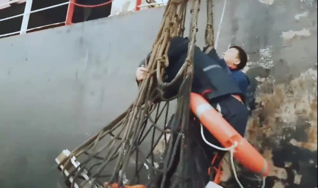 聽(tīng)聞呼救聲后,碼頭負(fù)責(zé)人嚴(yán)浩當(dāng)機(jī)立斷,一聲令下,立即啟動(dòng)救人應(yīng)急預(yù)案,現(xiàn)場(chǎng)職工陳炳銀、花衛(wèi)軍和高健翔等人迅速、果斷開(kāi)展救援。考慮到海水溫度低,衣服濕透增加重量后落水者體力消耗極快,無(wú)法通過(guò)救生繩進(jìn)行自救,便用救生繩系住救生圈拋至海中進(jìn)行營(yíng)救。