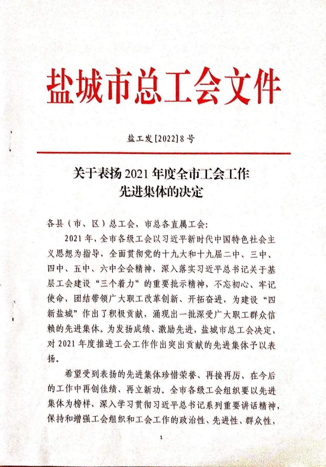 1月17日,在鹽城市總工會七屆二次全委(擴大)會議上傳來喜訊,集團工會聯合會被授予2021年度全市工會工作“先進集體”榮譽稱號。