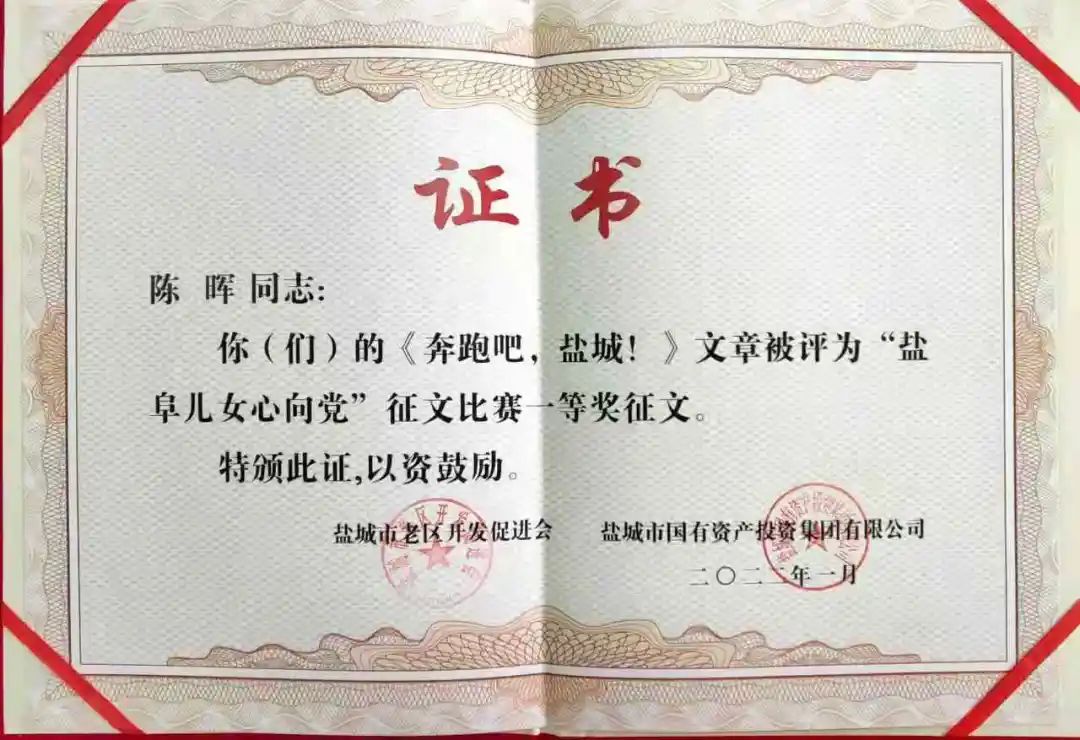 1月19日,由鹽城市老區(qū)開發(fā)促進會、鹽城市國有資產(chǎn)投資投資集團有限公司主辦的“鹽阜兒女心向黨”征文評審表彰會議在鹽城隆重舉行,江蘇響水港港務有限公司財務部副經(jīng)理陳暉的《奔跑吧,鹽城!》作品在298篇文章中脫穎而出,榮獲一等獎。