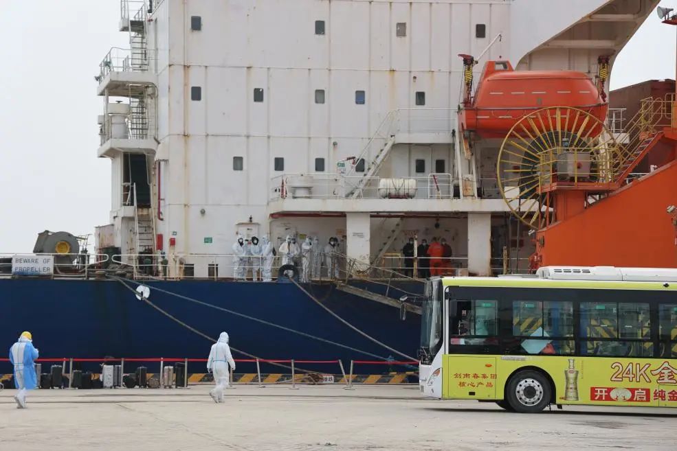 為確保中國船員換班工作“零等待”“零延時(shí)”,濱海港區(qū)第一時(shí)間啟動(dòng)船員換班閉環(huán)管控工作流程和應(yīng)急處置流程,與濱海縣聯(lián)防聯(lián)控機(jī)制各成員單位協(xié)同配合,確保換班中國船員自國門至家門的全程閉環(huán)管理。讓船員感受到回到家的溫暖。