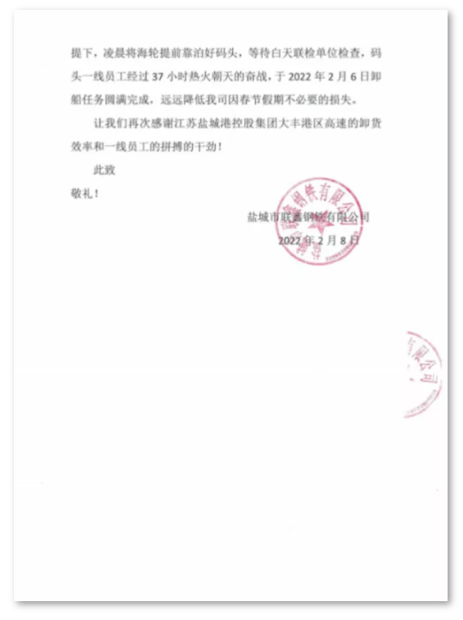 新年伊始,喜事連連。近日,鹽城港大豐港區(qū)港口公司收到鹽城市聯(lián)鑫鋼鐵有限公司送來的一封感謝信,對港口公司為客戶著想,以客戶至上,以一流專業(yè)的服務(wù)和生產(chǎn)組織能力、追求卓越的工作精神,高質(zhì)高效幫助客戶圓滿完成卸船任務(wù)表示由衷感謝。
