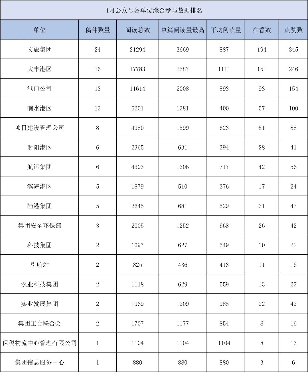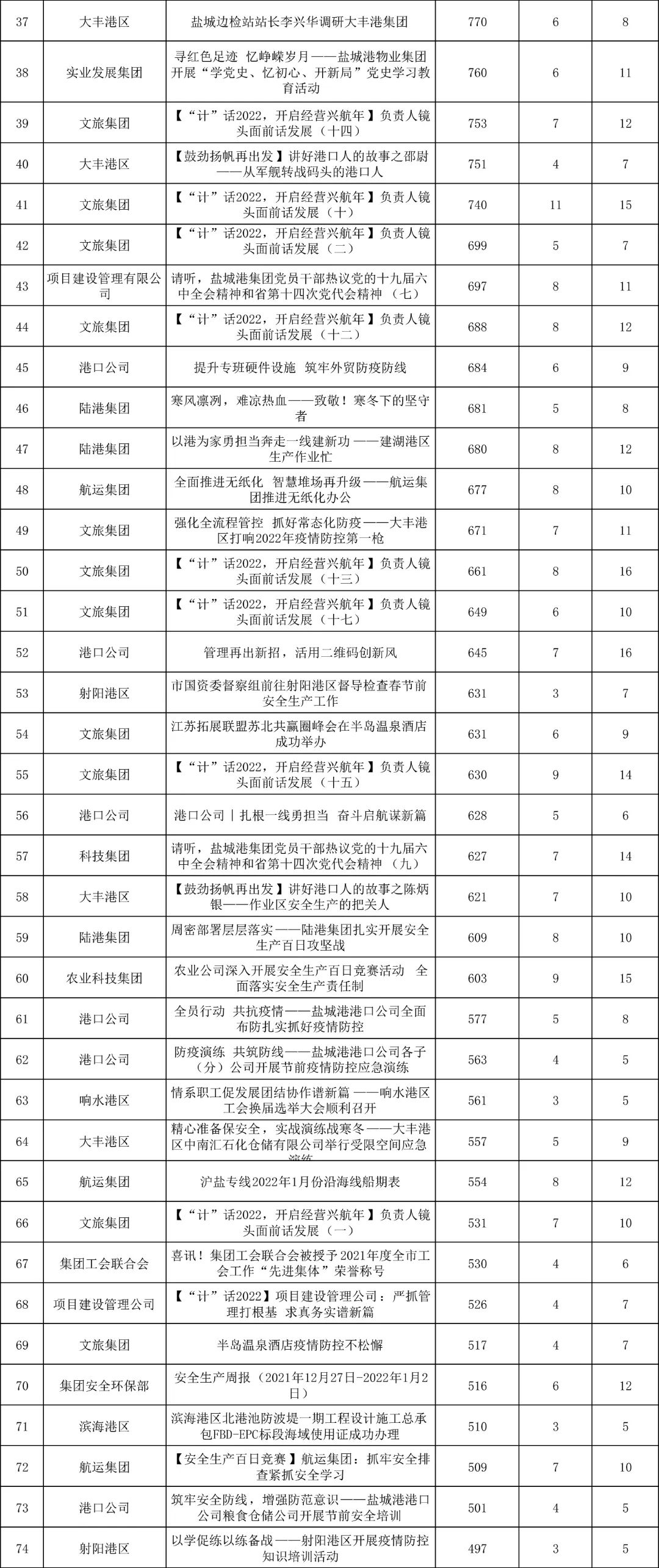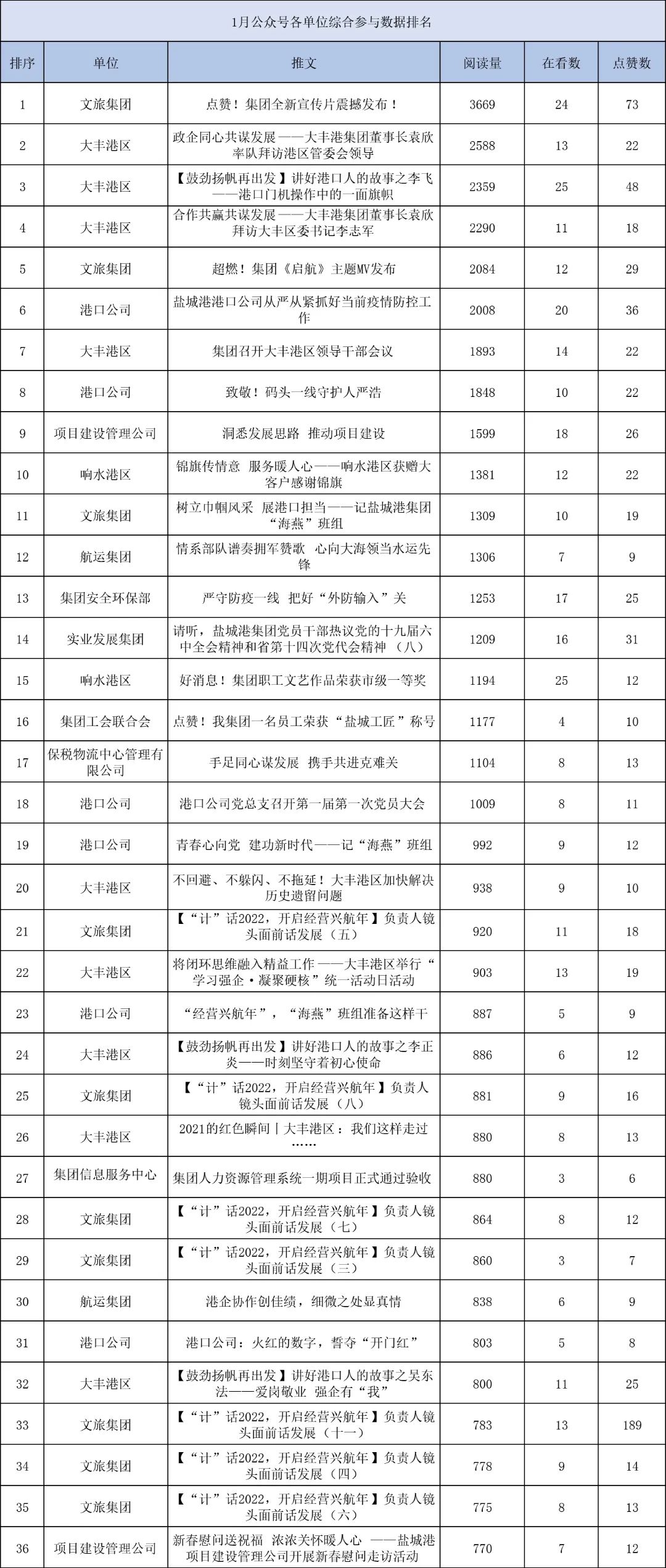 1月,“江蘇鹽城港控股集團”微信公眾號推送文章170篇,截至目前,閱讀總量14萬+,各單位供稿111篇。其中,文旅集團以2.1萬閱讀數(shù),24篇稿件量,遙遙領(lǐng)先;大豐港區(qū)以1.8萬閱讀數(shù),16篇稿件量,位列第二;港口公司、響水港區(qū)在供稿方面,以同樣13篇的數(shù)量并列第三,在閱讀量方面,港口公司以1.2萬的數(shù)量,位列單項第三;其他港口及板塊集團積極參與,踴躍投稿,情況較好。