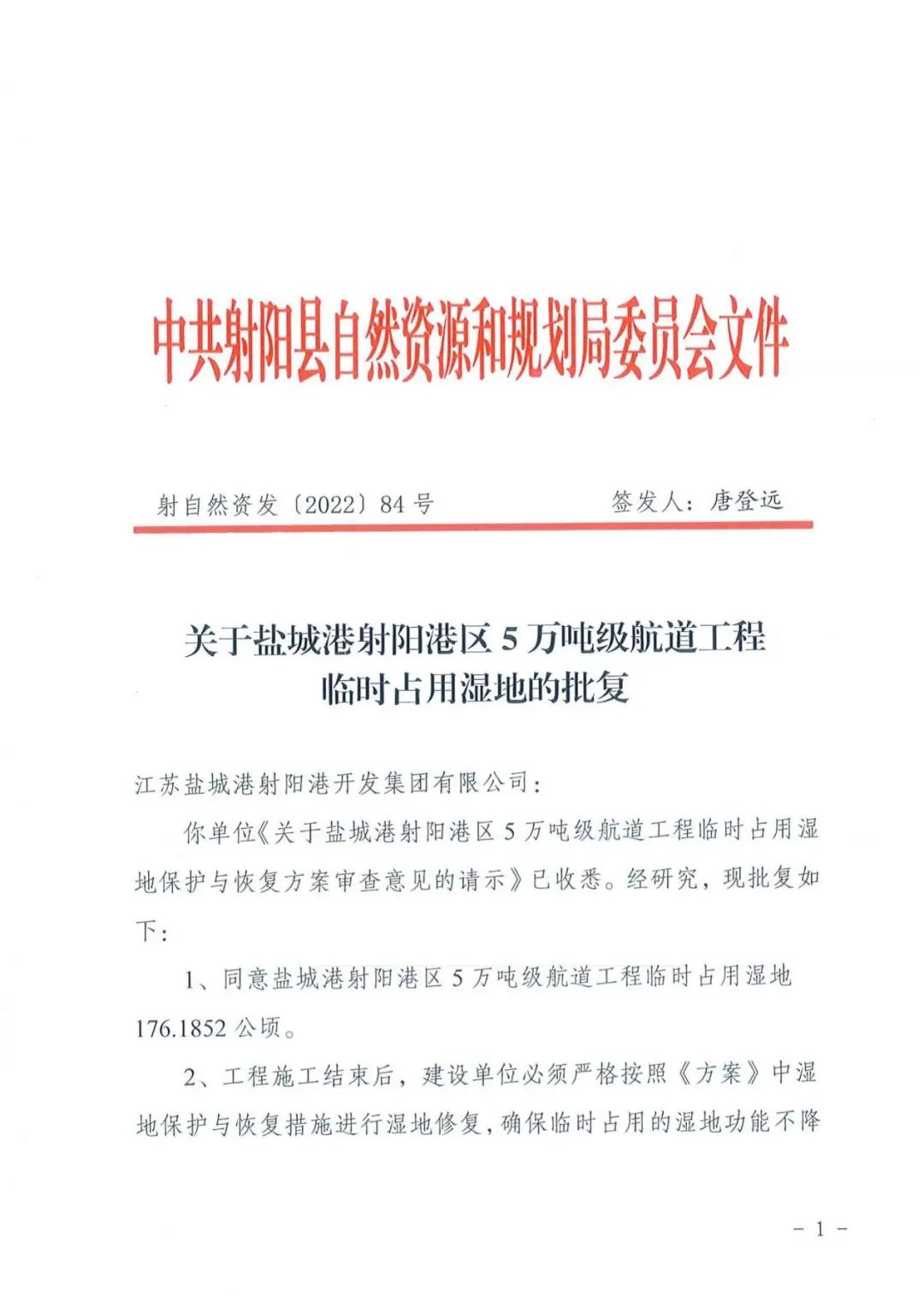 5月9日,鹽城港射陽(yáng)港區(qū)5萬(wàn)噸級(jí)航道工程臨時(shí)占用濕地取得縣自然資源和規(guī)劃局正式批復(fù)。至此,該項(xiàng)目已完成包括立項(xiàng)、通航評(píng)估、安全預(yù)評(píng)價(jià)等在內(nèi)的十二項(xiàng)前期手續(xù),向項(xiàng)目的正式開工又邁進(jìn)了堅(jiān)實(shí)一步。