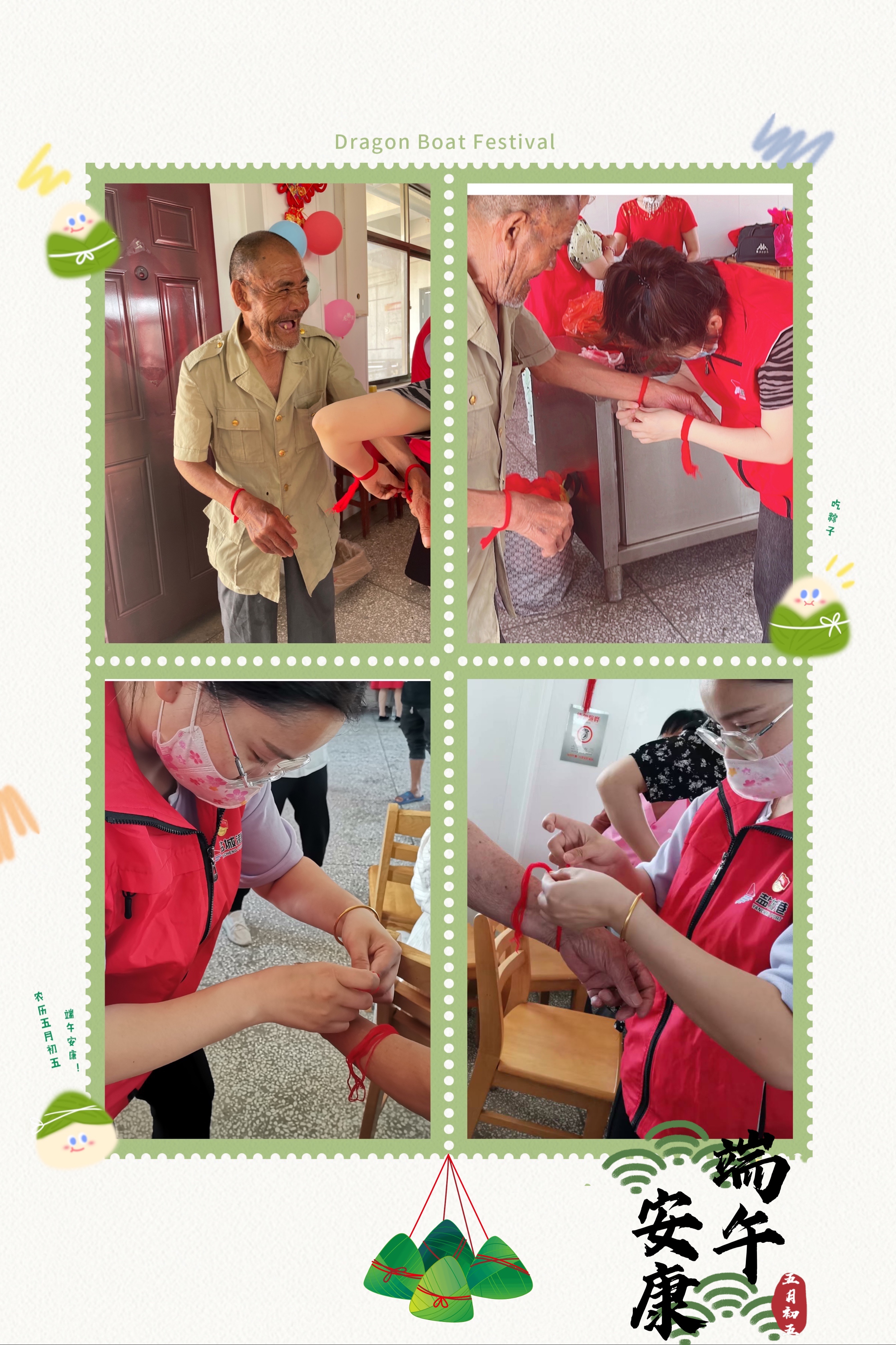 粽子飄香,絲線傳情。志愿者們?yōu)楝F(xiàn)場(chǎng)老人系紅線送祝福。老人們開(kāi)心的像個(gè)小大孩,爭(zhēng)相比著自己的紅線繩,現(xiàn)場(chǎng)一片歡聲笑語(yǔ)?!耙荒暌欢宋?,一歲一安康,艾葉飄香,紅線捆扎,串起港城間的和諧幸?!?。