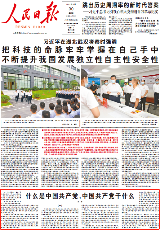 6月30日,人民日報頭版刊發(fā)“宣言”署名文章《什么是中國共產(chǎn)黨,中國共產(chǎn)黨干什么》。文章指出,了解中國,必須了解中國共產(chǎn)黨;了解中國共產(chǎn)黨,才能讀懂中國。歷史已經(jīng)證明并將繼續(xù)證明,中國共產(chǎn)黨是用馬克思主義武裝起來的覺悟者,是最廣大人民利益的守護者,是人類社會發(fā)展方向的引領(lǐng)者,是最光明最正義最壯麗事業(yè)的奮斗者。