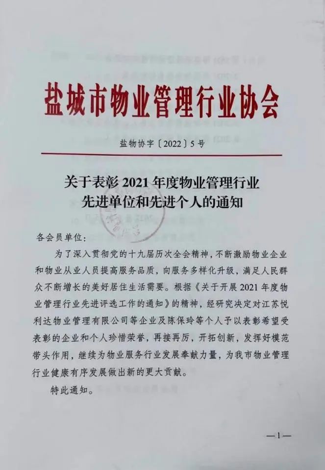 近日,鹽城市物業(yè)管理行業(yè)協(xié)會(huì)對(duì)全市物業(yè)管理行業(yè)先進(jìn)單位和先進(jìn)個(gè)人進(jìn)行了表彰,江蘇鹽城港物業(yè)集團(tuán)有限公司獲評(píng)“2021年度物業(yè)管理行業(yè)先進(jìn)單位”榮譽(yù)稱(chēng)號(hào)。