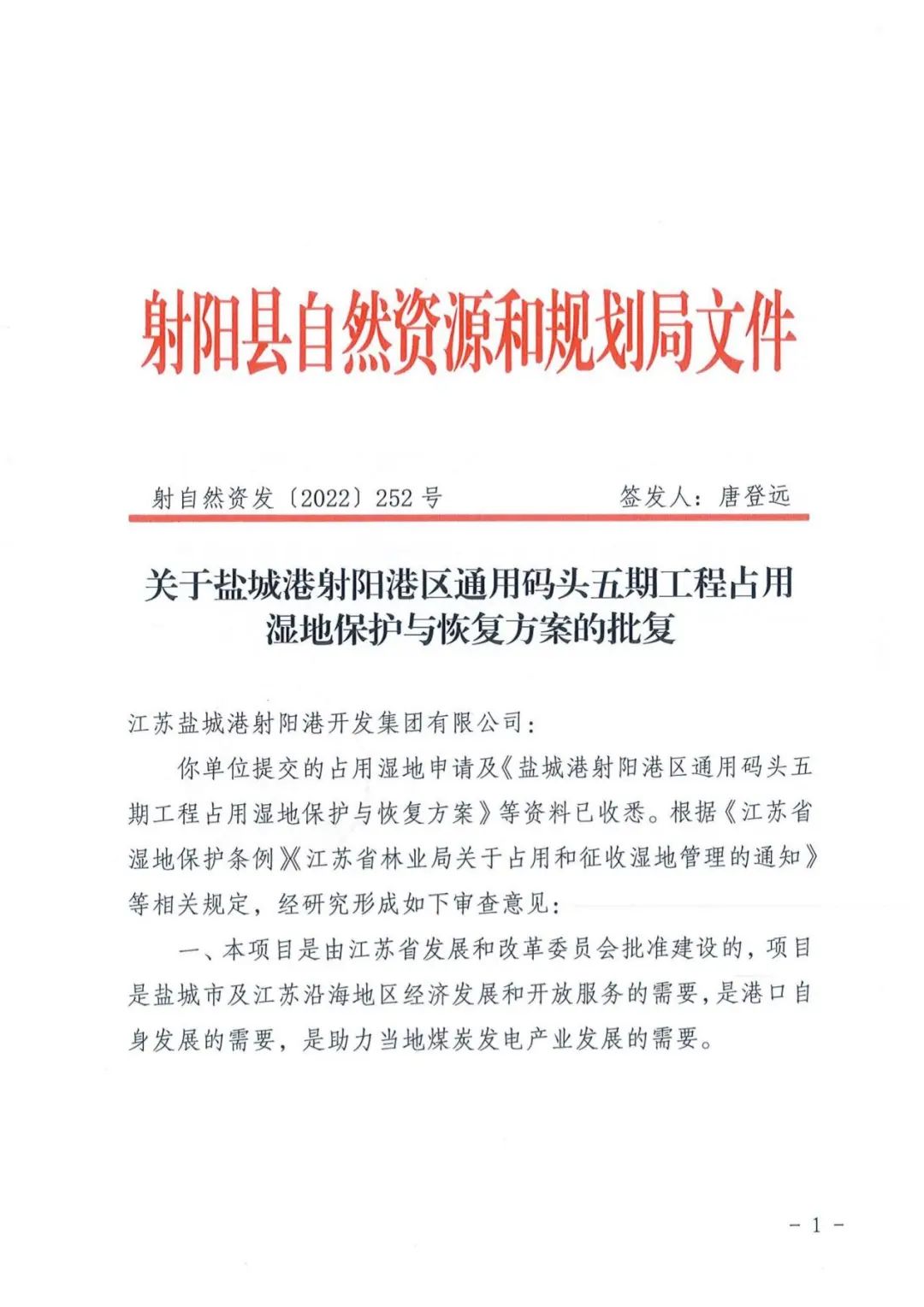 10月25日,鹽城港射陽港區(qū)通用碼頭五期工程占用濕地保護(hù)與恢復(fù)方案取得射陽縣自然資源和規(guī)劃局正式批復(fù),至此,該項(xiàng)目已完成包括備案、穩(wěn)評、岸線批復(fù)等多項(xiàng)前期手續(xù)辦理,為加快推進(jìn)該項(xiàng)目的正式開工奠定了堅(jiān)實(shí)基礎(chǔ)。