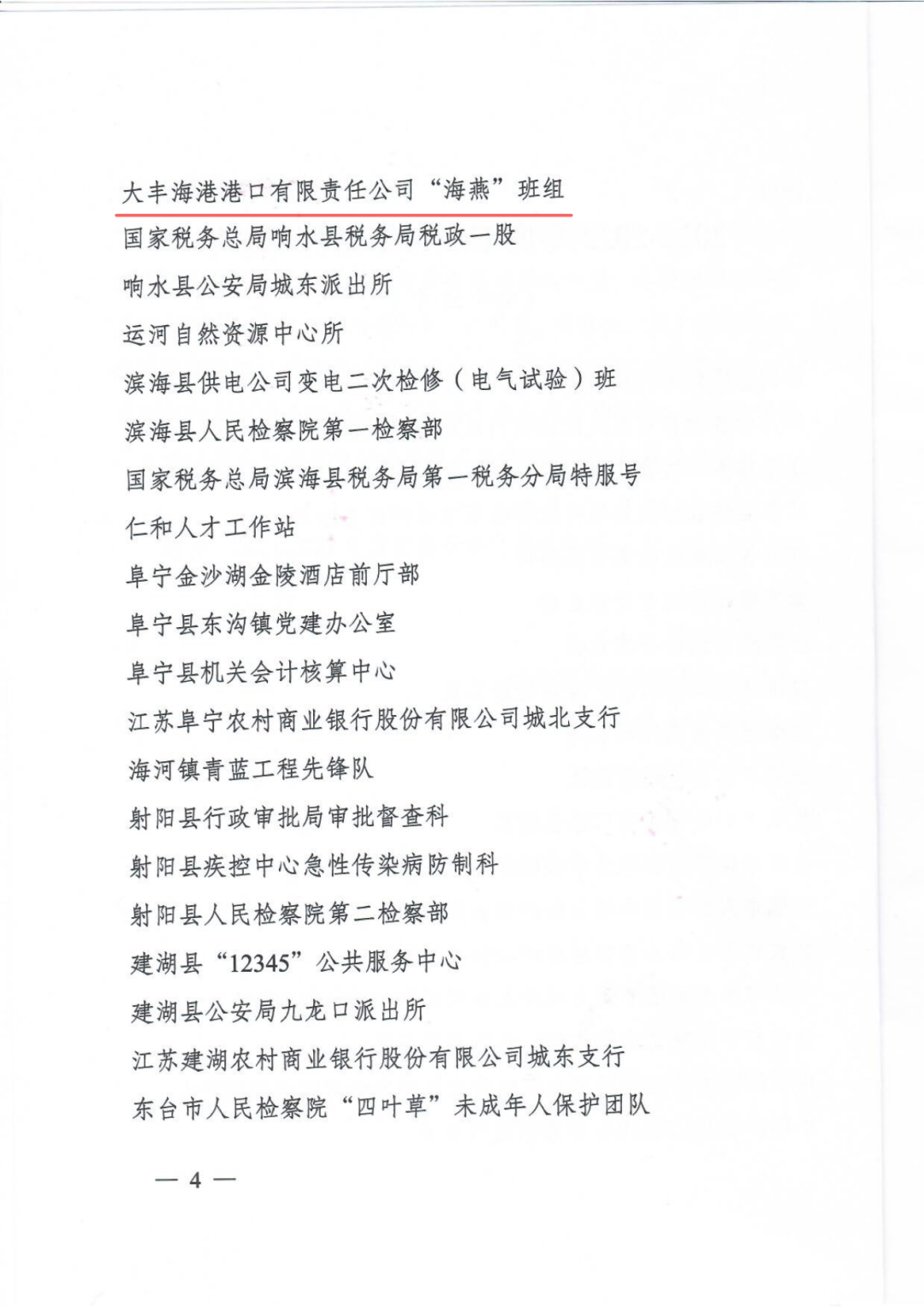 近日,共青團(tuán)鹽城市委發(fā)布《關(guān)于命名2021-2022年度市級(jí)青年文明號(hào)的決定》,鹽城港航運(yùn)集團(tuán)生產(chǎn)操作創(chuàng)新團(tuán)隊(duì)、大豐海港港口有限責(zé)任公司“海燕”班組以?xún)?yōu)異的表現(xiàn)榮獲“2021-2022年度市級(jí)青年文明號(hào)”稱(chēng)號(hào)。