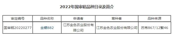 根據(jù)農(nóng)業(yè)農(nóng)村部公告第625號(hào)公布農(nóng)作物新品種審定名單,江蘇金色農(nóng)業(yè)股份有限公司自主選育的水稻新品種金粳882名列其中,同時(shí)也是該公司第三個(gè)自主選育的水稻新品種。