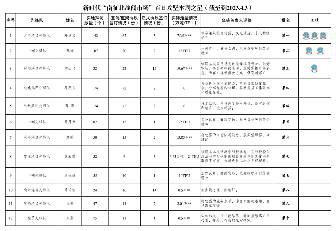 1.累計拜訪客戶數量3294家:其中多式聯運第二先鋒隊593家,大豐港區先鋒隊585家,黨員先鋒隊335家,巾幗先鋒隊263家,建湖港區先鋒隊245家,多式聯運第一先鋒隊223家,射陽港區先鋒隊189家,航運集團先鋒隊187家,濱海港區先鋒隊181家,響水港區先鋒隊132家,亭湖港區先鋒隊131家,阜寧港區先鋒隊117家,青年先鋒隊113家。