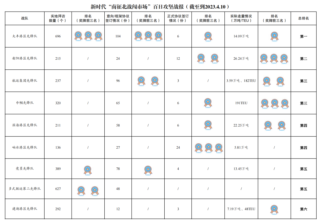 第一名:大豐港區(qū)先鋒隊 陸青文(拜訪客戶162家,簽訂意向協(xié)議67份,簽訂正式協(xié)議6份,實際走量14.09萬噸)