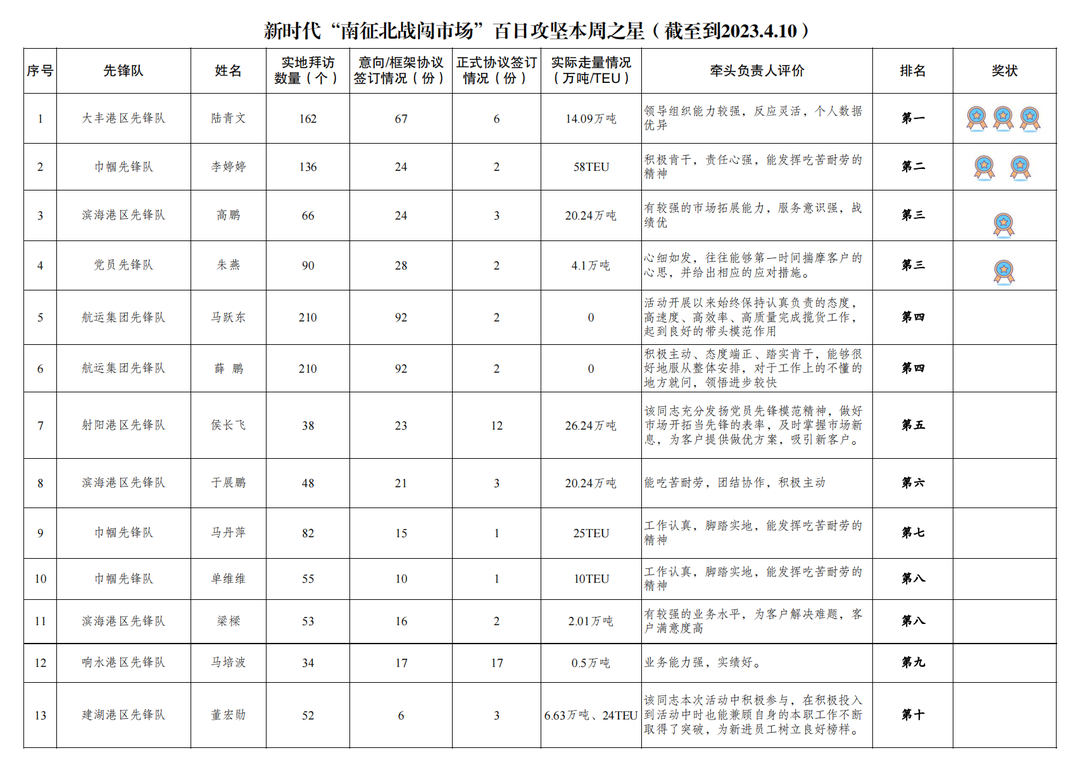 第三名:濱海港區(qū)先鋒隊 高鵬(拜訪客戶66家,簽訂意向協(xié)議24份,簽訂正式協(xié)議3份,實際走量20.24萬噸),黨員先鋒隊 朱燕(拜訪客戶90家,簽訂意向協(xié)議28份,簽訂正式協(xié)議2份,實際走量4.1萬噸)