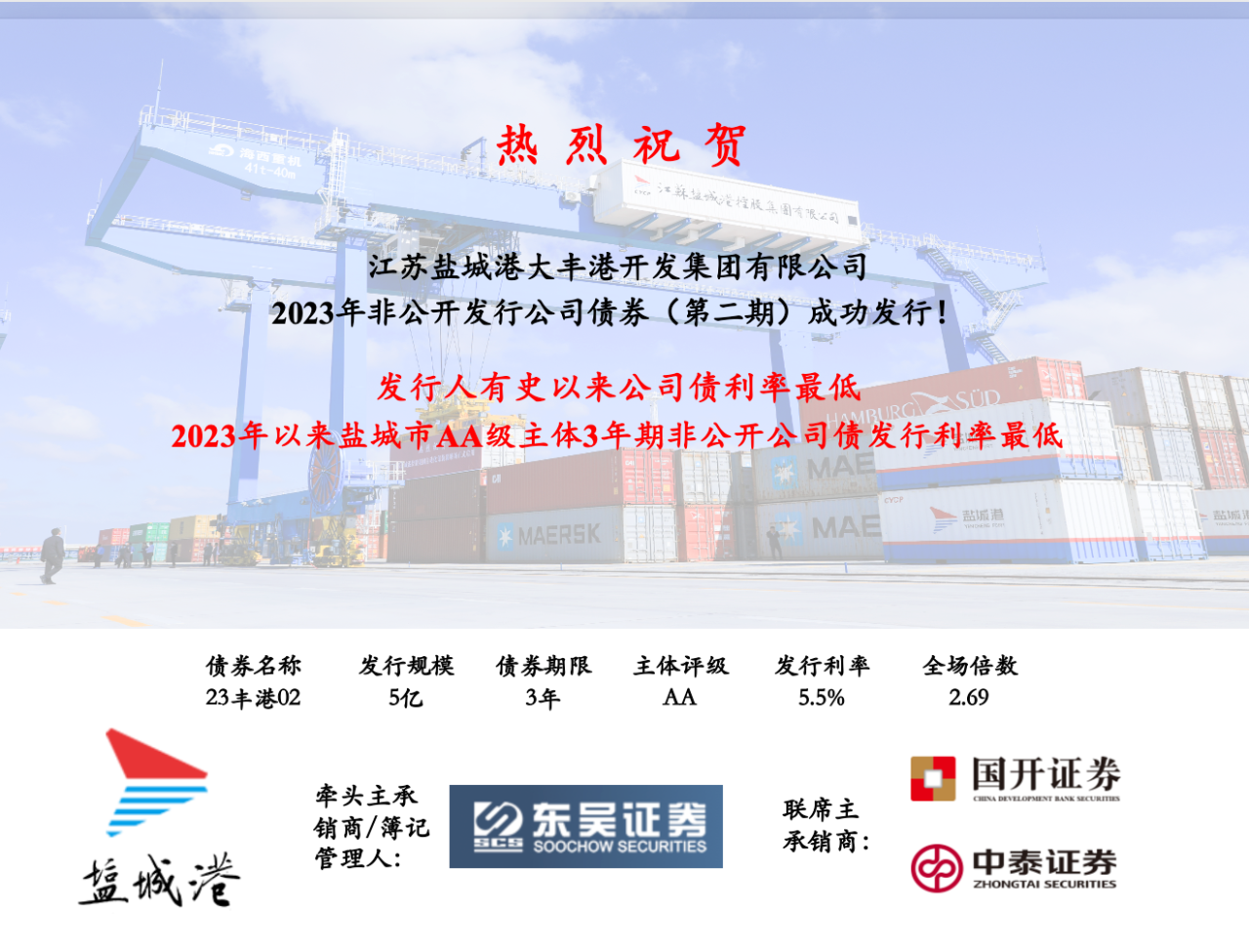 6月14日,在鹽城港集團成立三周年之際,大豐港開發(fā)集團2023年面向?qū)I(yè)投資者非公開發(fā)行公司債券(私募公司債券第二期)簿記成功。本期債券發(fā)行規(guī)模5億元,期限3年,票面利率5.5%,全場認購倍數(shù)2.69倍,創(chuàng)下大豐港開發(fā)集團私募公司債券利率歷史最低紀錄。