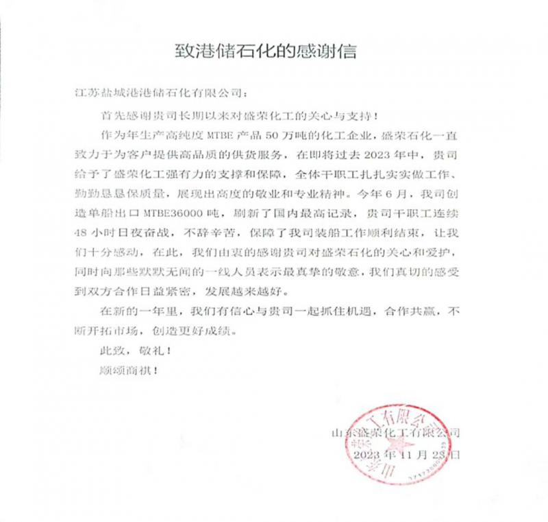 今年以來港儲石化公司全體干部職工堅(jiān)持以“時間就是金錢,程序體現(xiàn)規(guī)矩,質(zhì)量鑄就精品,效率就是生命”為宗旨,不斷提升服務(wù)品質(zhì)及工作效率,獲得了客戶的贊賞與肯定。近期,合作客戶山東玉皇盛榮化工寄來一封感謝信,信中內(nèi)容充分肯定了港儲石化的服務(wù)品質(zhì),并由衷地表達(dá)了感謝。
