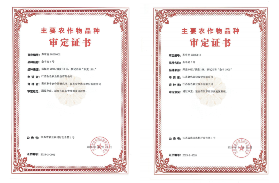 近日,農(nóng)業(yè)科技集團所屬金色農(nóng)業(yè)自主選育的“金豐麥4號”“金豐麥5號”兩個小麥品種順利通過江蘇省主要農(nóng)作物品種審定,并完成公示程序。這是繼2019年-2023年期間獲審的“金豐麥1、2、3號”后,又一批通過審定的小麥品種,至此,農(nóng)業(yè)科技集團形成具有自主品種權(quán)的“金豐麥”品系。