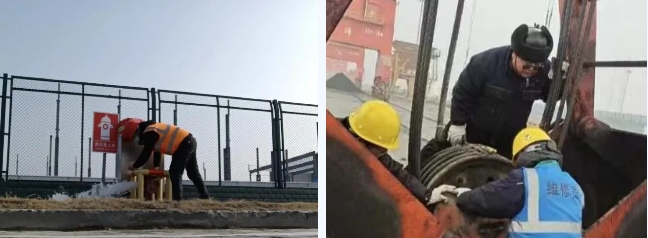 針對(duì)突發(fā)大幅降溫狀況,港區(qū)立即組織“四防”安全專項(xiàng)檢查,在碼頭現(xiàn)場著重檢查高大設(shè)備防風(fēng)、室外管線防凍、機(jī)械運(yùn)行防寒、車輛人員防滑等防范措施的落實(shí)和各崗位人員冬季勞保用品規(guī)范的配備,保障各項(xiàng)防寒潮措施落地生根;同時(shí)檢查了現(xiàn)場應(yīng)急物資儲(chǔ)備,確保防滑沙、融雪劑、除雪工具等數(shù)量充足,存放規(guī)范。