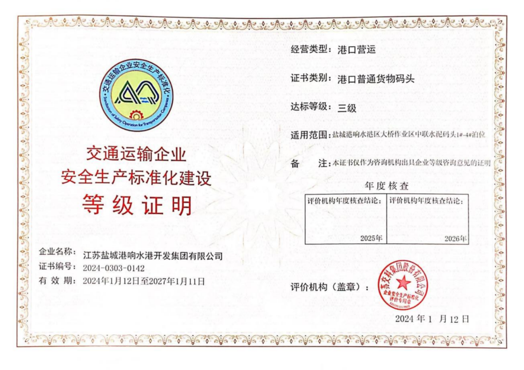 近日,鹽城港響水港區(qū)灌江港務(wù)分公司順利通過交通運(yùn)輸企業(yè)安全生產(chǎn)標(biāo)準(zhǔn)化認(rèn)證考核,并取得“交通運(yùn)輸企業(yè)安全生產(chǎn)標(biāo)準(zhǔn)化建設(shè)三級證書”,標(biāo)志著響水港區(qū)灌江港務(wù)分公司安全生產(chǎn)管理工作邁上新臺階。