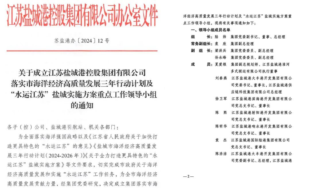 2月3日,集團發布了《關于成立江蘇鹽城港控股集團有限公司落實市海洋經濟高質量發展三年行動計劃及“水運江蘇”鹽城實施方案重點工作領導小組的通知》,領導小組下設一辦兩組,明確各項工作責任單位和責任人。3月2日,工作領導小組召開第一次調度會議,對各項工作進行了系統部署,深入推進海洋經濟高質量發展和水運江蘇重點工作。