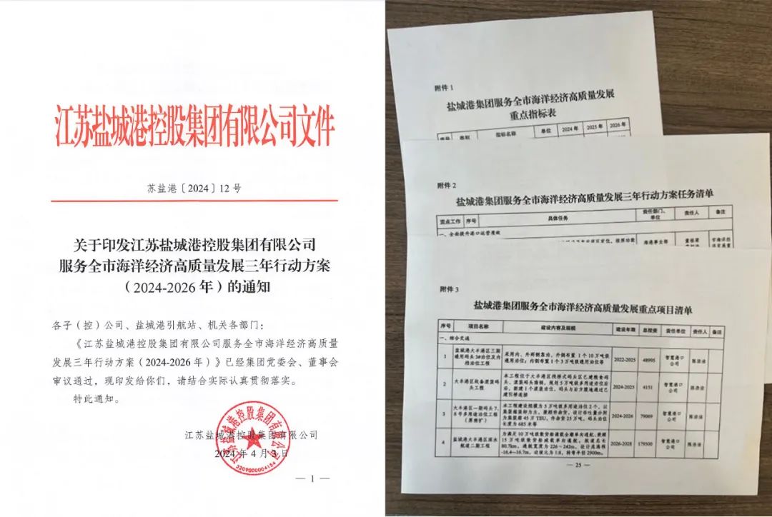 全面落實省市海洋經濟高質量發展和加快打造更具特色的“水運江蘇”三年行動計劃,貫徹執行集團黨委工作部署,印發鹽城港集團服務全市海洋經濟高質量發展三年行動方案,形成44條重點指標,96項任務責任清單。以全面提高海洋經濟服務水平,積極融入海洋經濟高質量發展為總體目標。力爭到2026年,港口基礎設施能級大幅提升,港口貨物吞吐量超20000萬噸,集裝箱吞吐量超120萬TEU,累計開通航線總數達60條,全力打造“淮河流域出海門戶港”“五新示范港”“特色港口集群”等港口品牌形象,充分發揮鹽城港集團在服務全市海洋經濟發展中的重要作用。