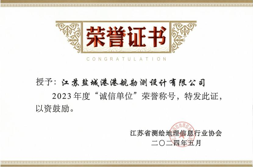 近日,江蘇省測繪地理信息學會公布2023年度“誠信單位”評定結果名單,江蘇鹽城港港航勘測設計有限公司被評為2023年度“誠信單位”,這一榮譽彰顯了業界對勘測設計公司經營管理和信用體系建設等方面的認可,更是對勘測設計公司在測繪地理信息領域誠信經營、優質服務的肯定,對于助推市場經營和品牌打造起到積極作用。