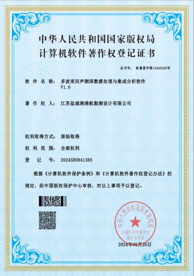 近日,根據《計算機軟件保護條例》和《計算機軟件著作權登記辦法》的規定,經中國版權保護中心審核,鹽城港港航勘測設計有限公司成功獲取《多波束回聲測深數據處理與集成分析軟件V1.0》《水環境智能分析系統V1.0》《遙感數據自動化處理平臺V1.0》三項軟件著作權,數個專利申請也同步推進中。